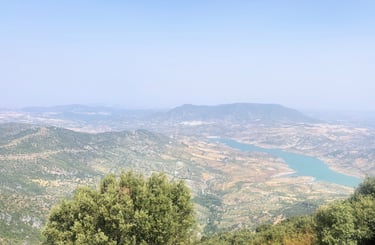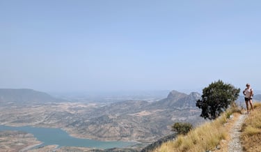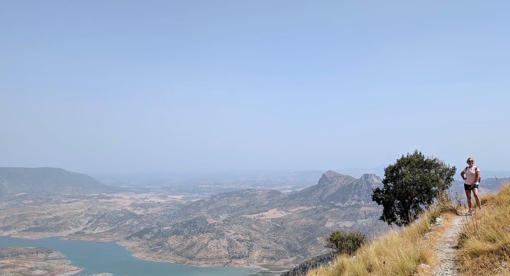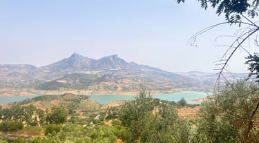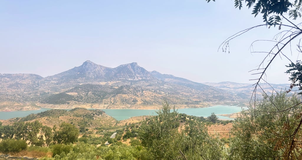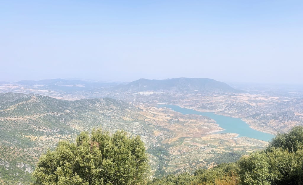 On one side: a green-turquoise lake so far below it looks like a painting. That’s the Zahara–El Gastor reservoir. The colour that doesn’t look real until you stand above it.