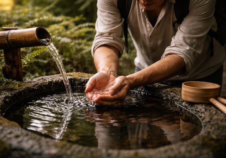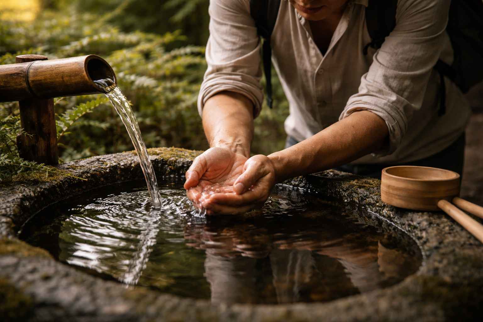 Before entering a shrine, people often wash their hands at a stone basin.